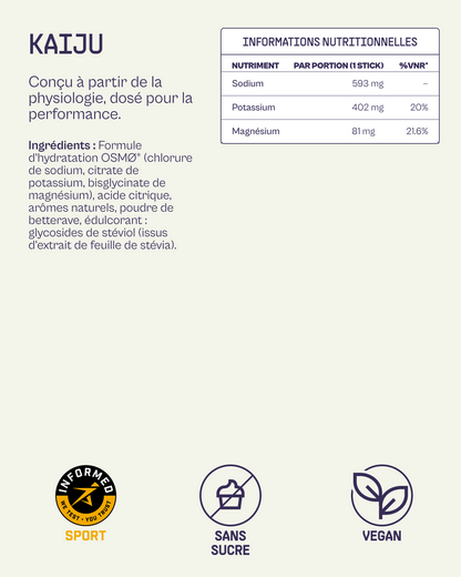 Kaiju repose sur la physiologie : des électrolytes haute performance, sans superflu, avec une formule utilisable au quotidien sans craindre les ingrédients cachés ou nocifs.