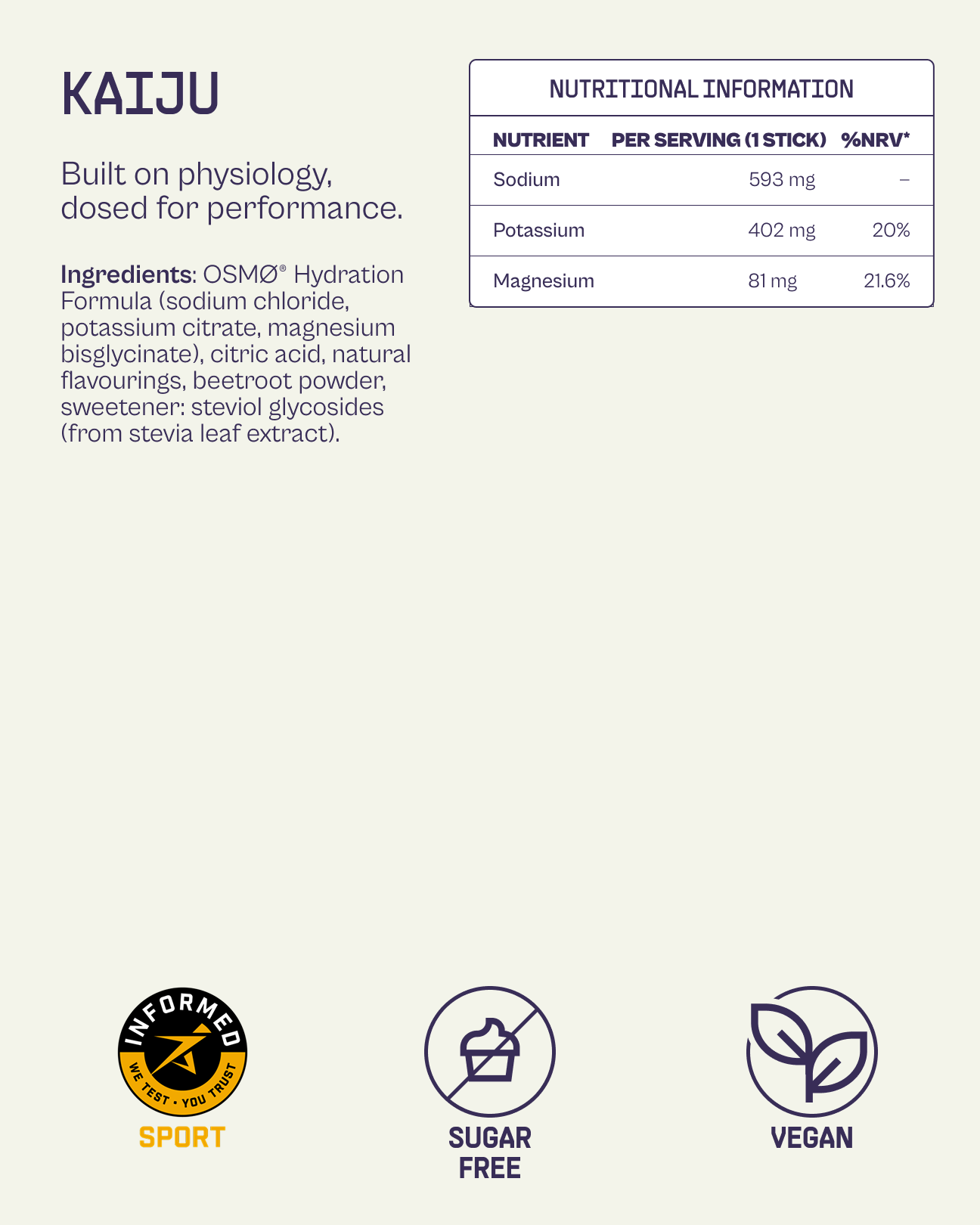 Kaiju is a zero-sugar electrolyte drink mix with everything you need and nothing you don’t. We use meaningful doses of the key electrolytes you actually lose in sweat, especially sodium, potassium and magnesium, instead of sprinkling tiny amounts across a long ingredient list. Most “sports drinks” are built around sugar, artificial colours, fillers and marketing claims. Kaiju is built around physiology: high-performance electrolytes, no junk, and a formula you can use every day without worrying about hidden & harmful ingredients.